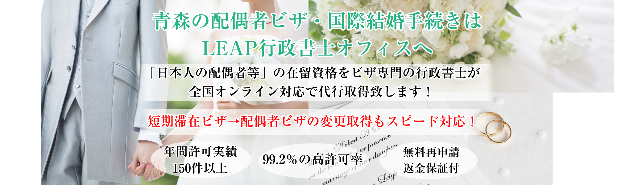 当事務所は、青森県の国際結婚や配偶者ビザに関する手続きでお悩みの方々に向けて、全国オンライン対応で代行サポートをしております、国際結婚・ビザ専門の行政書士事務所です。