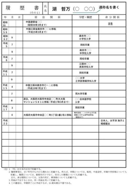 帰化申請に必要な履歴書(その1)は、出生から現在までの全ての住所地、学歴・職歴(アルバイト含む)・身分関係を時系列ごとに記入していきます。